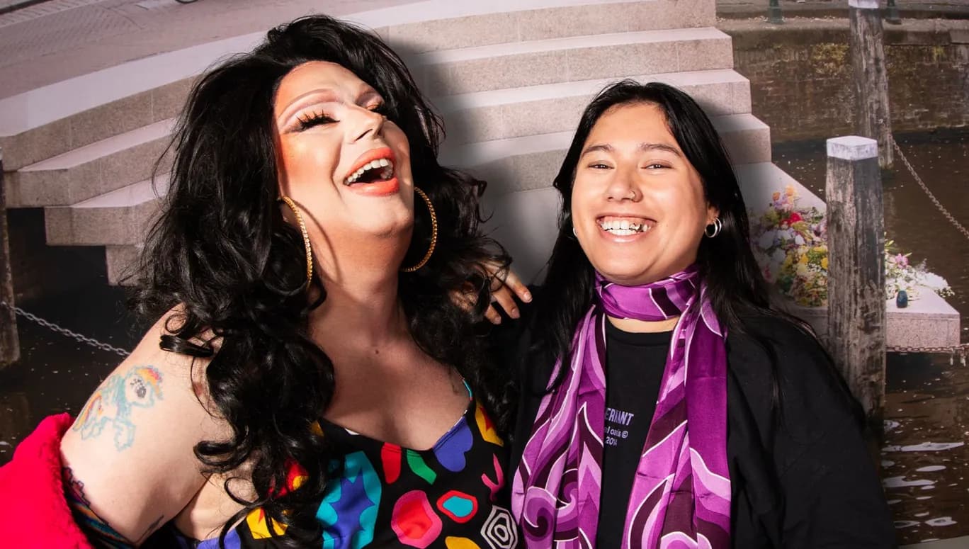 Deze ontmoeting is tussen dragqueen Heisa Jynx (41), links op de foto, en Raven Kooren (25), evenementmanager en programmeur.