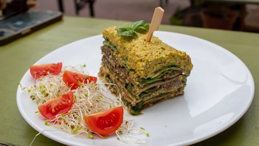 Favoriet: Lasagne van courgette, spinazie, paddenstoelen en ricotta (van amandelen)