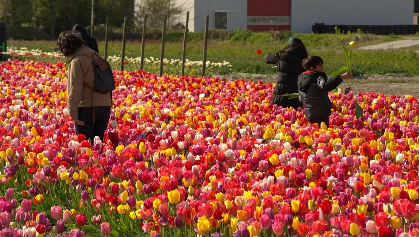 Annemieke’s Pluktuin heeft 3000 vierkante meter aan tulpen, die je voor €0,40 per tulp mee naar huis neemt. Hier pluk je dus fluitend een boeket bij elkaar.